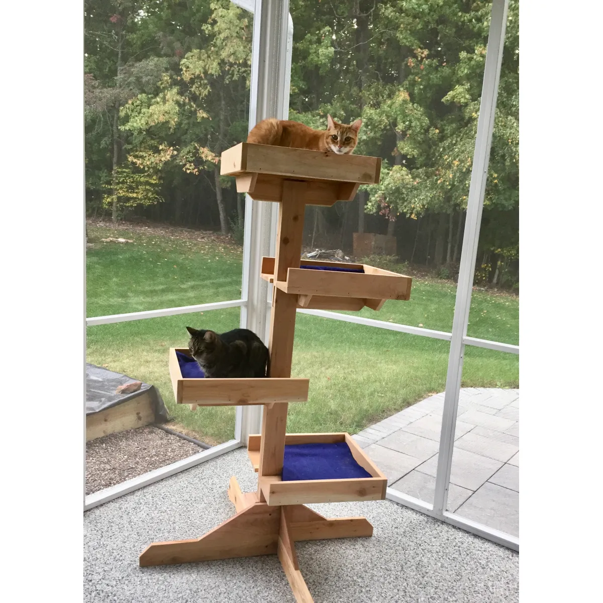 Coming with four tiered platforms, this cedar cat tree for outdoor cats makes it easy for kitties of all ages and sizes to jump all the way to the top 61" high perch! Each is staggered like steps around a central post, which is attached to a sturdy 42" diameter 4-legged base that won’t wobble or tip over during active play. It is made of solid cedar wood, sanded smooth for comfort and safety, and has four tiers that provide a place for one very special or multiple furry friends to climb, play, and feel secure outdoors. Each tier is securely attached with solid framing that can hold the weight of even heavier adult cats.