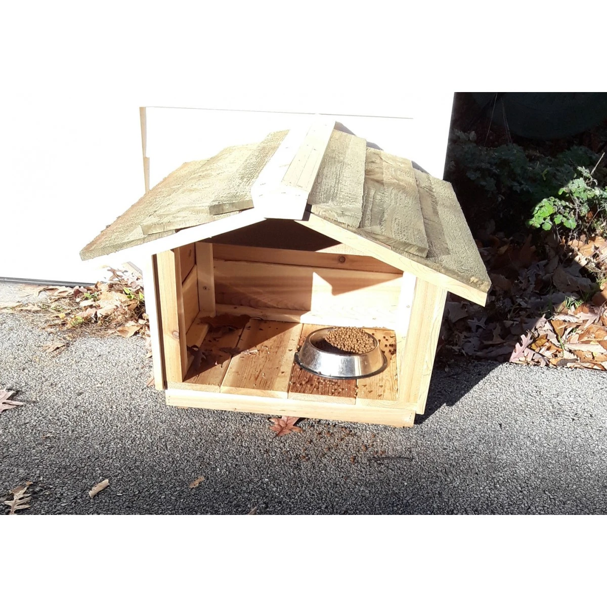 Keep your outdoor pets and feral cats safe and dry during mealtime with this cedar wood cat feeding station. Feral cats may not live inside your home, but they deserve some love, too – as well as a clean and dry place to grab a meal! These outdoor cat feeders are an ideal way to tempt feral or outdoor cats with a hearty breakfast, lunch, or dinner. They feature a roomy interior and a cedar-construction exterior. Each cat food shelter is individually handcrafted by experts using high-quality materials and comes with an extended roof to keep the outside cats dry as they enjoy a succulent supper.