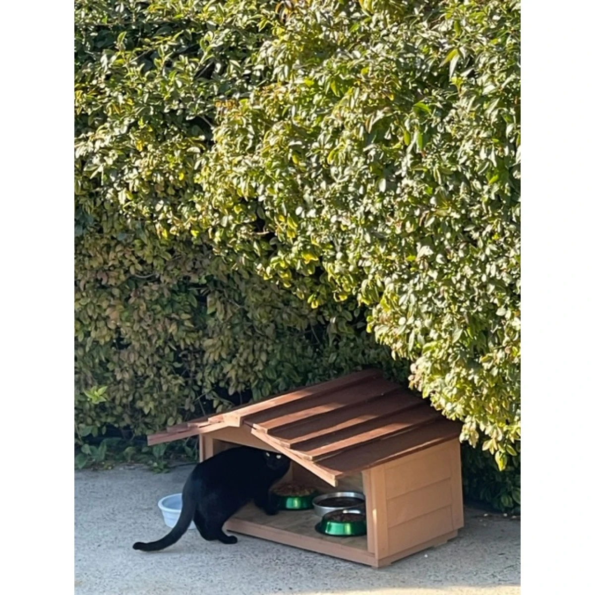 Placing one of these feral cat feeding stations in your yard is an excellent idea whether you're a pet enthusiast, show concern for the safety of all animals, or love everything about cats! You can even use this practical product to feed your home cats if they live exclusively outdoors or split their time between inside and out. You'll keep the food and water clean and dry under the sturdy roof for those friendly felines, so every meal will feel like a gourmet experience! And if you need shelter for more than 4 food bowls, you may check our double-sided large feeding station for feral cats.