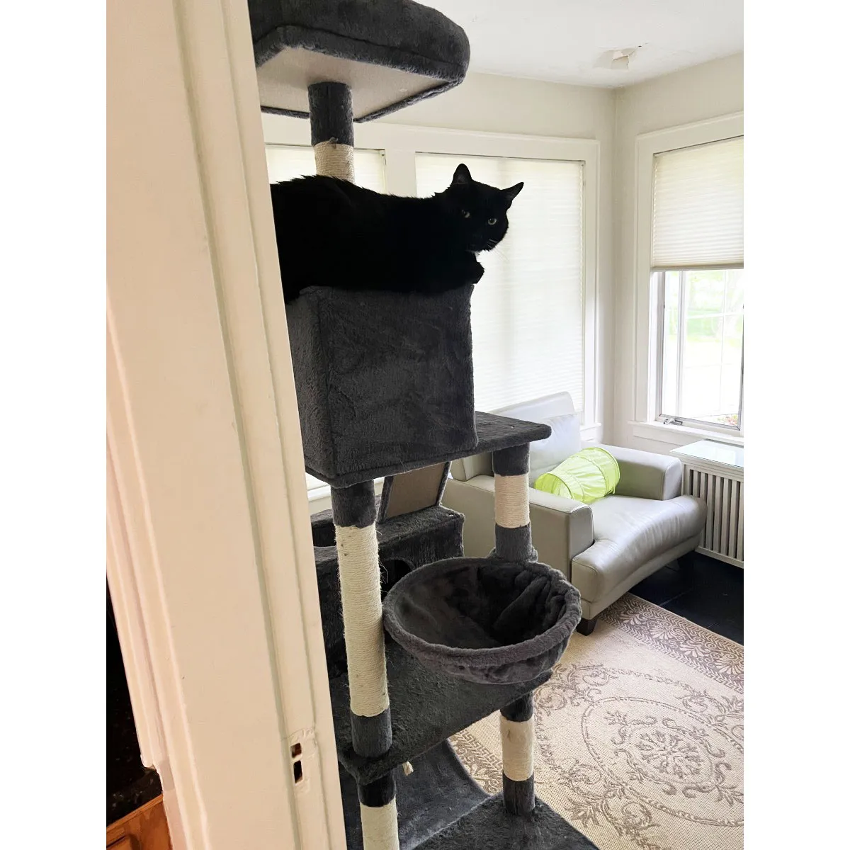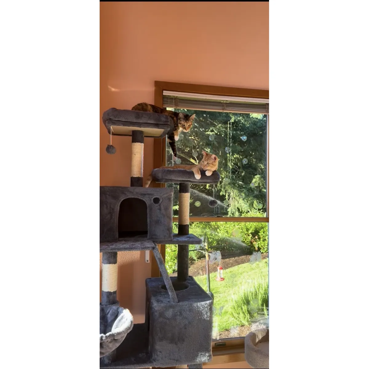For added comfort, there's a plush hammock at the bottom, ideal for larger cats or seniors, and a fun, fluffy hanging basket offers a great vantage point for the kitty to stand guard. The cat tower also features a reinforced base for enhanced stability, multiple sturdy sisal scratching posts, and an anti-tip kit for added safety. Designed for up to six cats weighing up to 15 pounds each, this stand brings together comfort, exercise, and enrichment. With its anti-tip safety kit and generous design, it's the ultimate all-in-one cat activity center for your feline family.