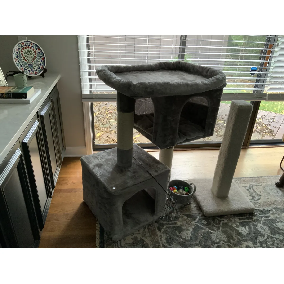 This plush cat condo for large cats features multiple spots for your feline friends to rest comfortably because large kitties deserve a large amount of love. The extra large bed on top is ideal for stretching out and grabbing that morning sun, complete with padded raised edges for extra comfort. Right under that is a dual-entrance cat condo that offers a wide view of the outside world as well as a little inside hiding spot.