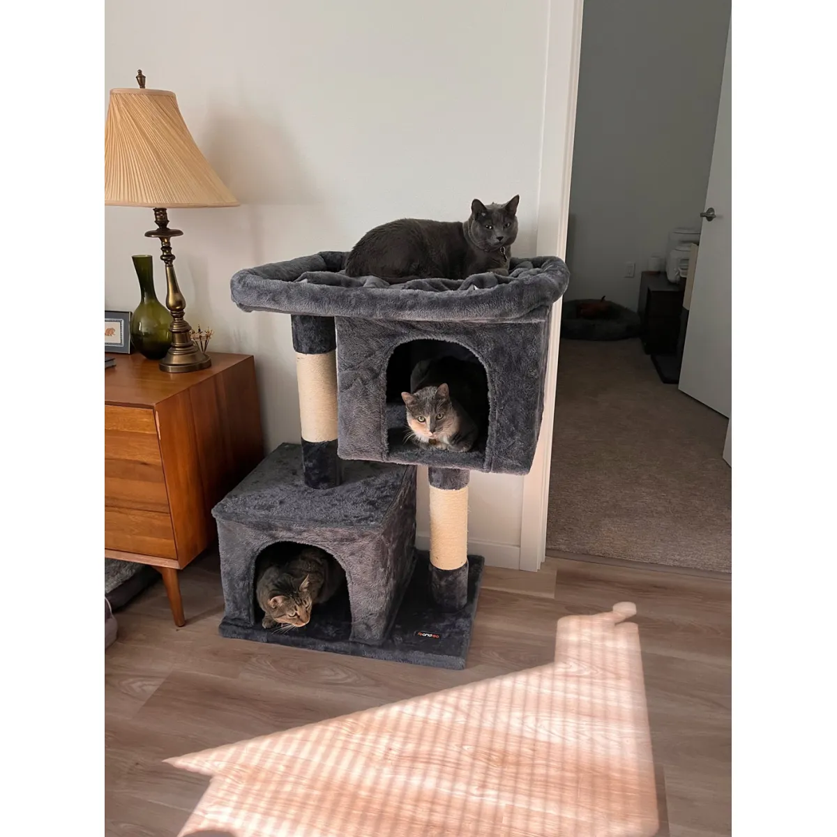 At the base of this cat playground is another plush-lined single-door hideaway for the large senior cats who have trouble jumping, while the multi-level design still offers plenty for frisky adults who are still practicing their daily climbing. Add a pair of sturdy sisal scratching posts, and your beloved pet will purr up a storm in no time! Perfect for one extra large cat or two to three larger siblings, this cat condo can hold up to 44 lbs. The available colors (beige, light, or dark gray) can blend into almost any home decor. We have this condo a little bit smaller, but if you are looking for a bigger one, check out the other cat trees for large cats here.