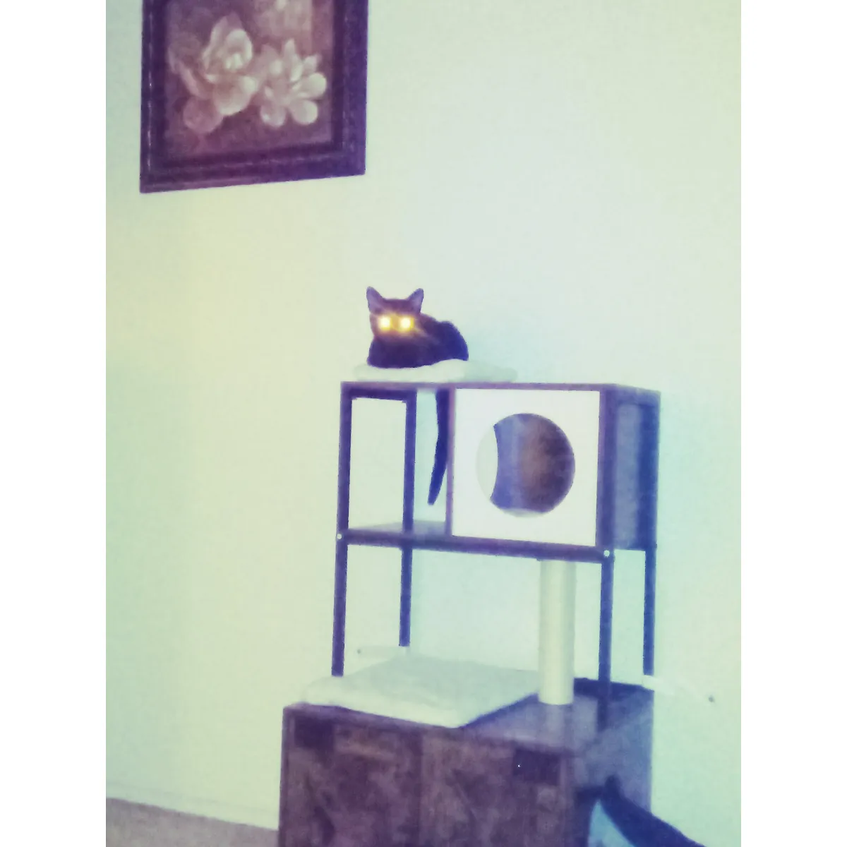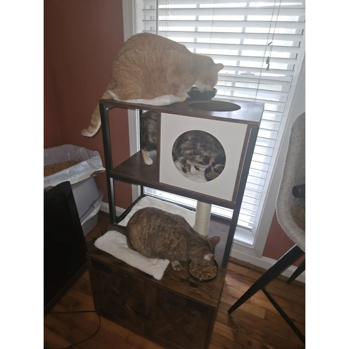 Add both style and substance to your decor with this stunning cat tree with a house for the cat litter box. Great for a small space or an elegant family room, it's designed for multi-cat households or anyone who loves multi-purpose creations. Crafted from particleboard in a neutral rustic brown with a matte black metal frame, this cat tree fits multiple needs for your feline friend. There's a pair of padded perches, including one at the top level, where kitty can catch a nap or catch a look at what's going on in their home.