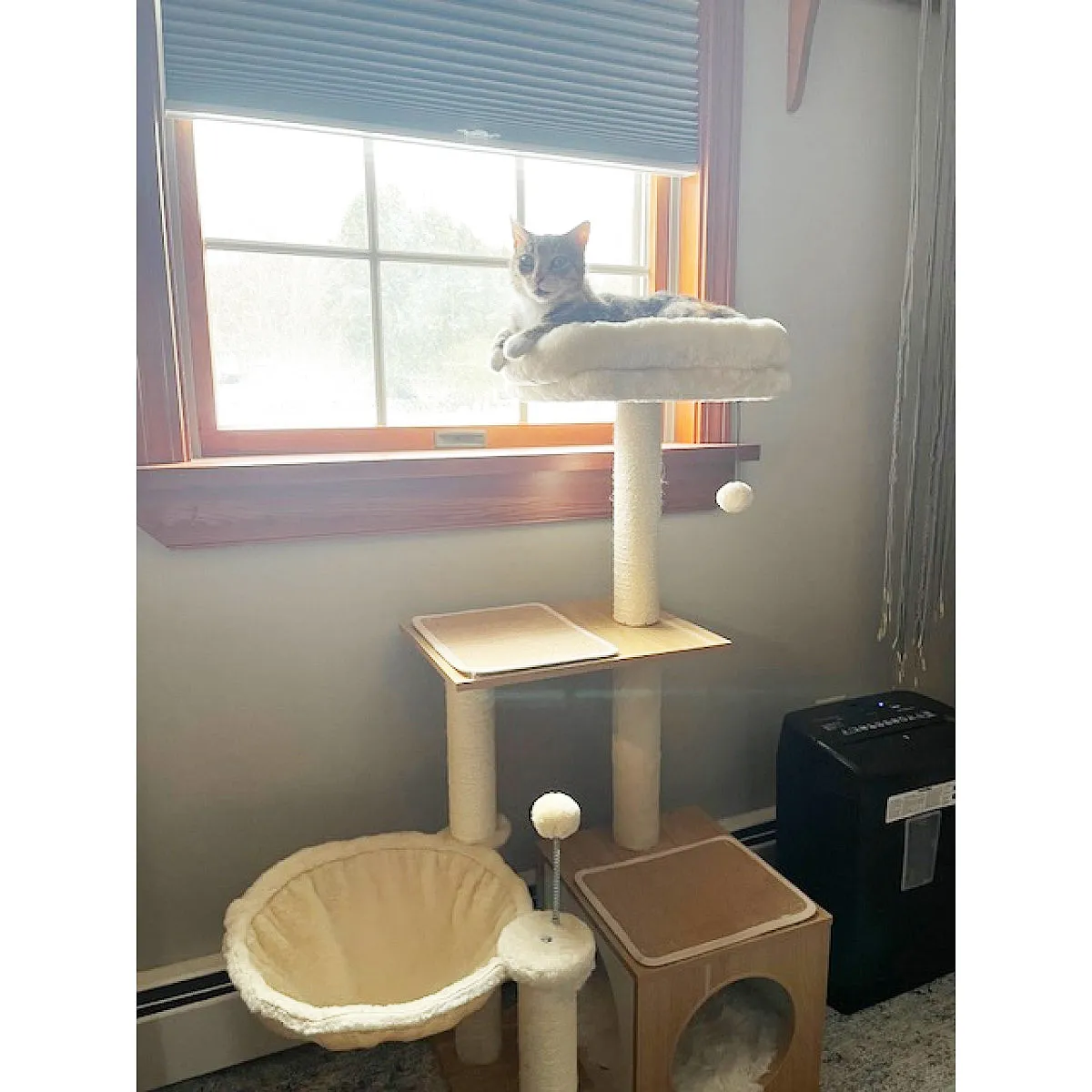 Treat your beloved cats to a little piece of purr-a-dise with this modern, multi-level cat tree featuring a sturdy wood frame. It features everything a feline friend could want to make each day memorable. At the base, a spacious condo provides the perfect hideaway for peaceful naps and serves as a sturdy foundation for the entire wooden structure. The post next to that has a silly spring ball at the top for cats to bat around, plus a cozy basket hammock to curl up in when playtime is over.