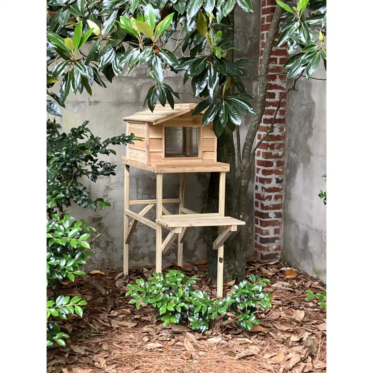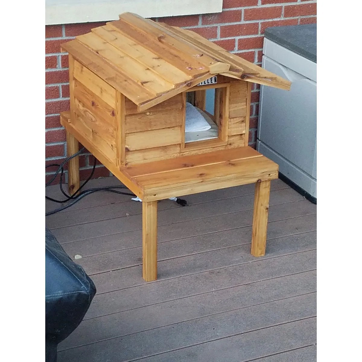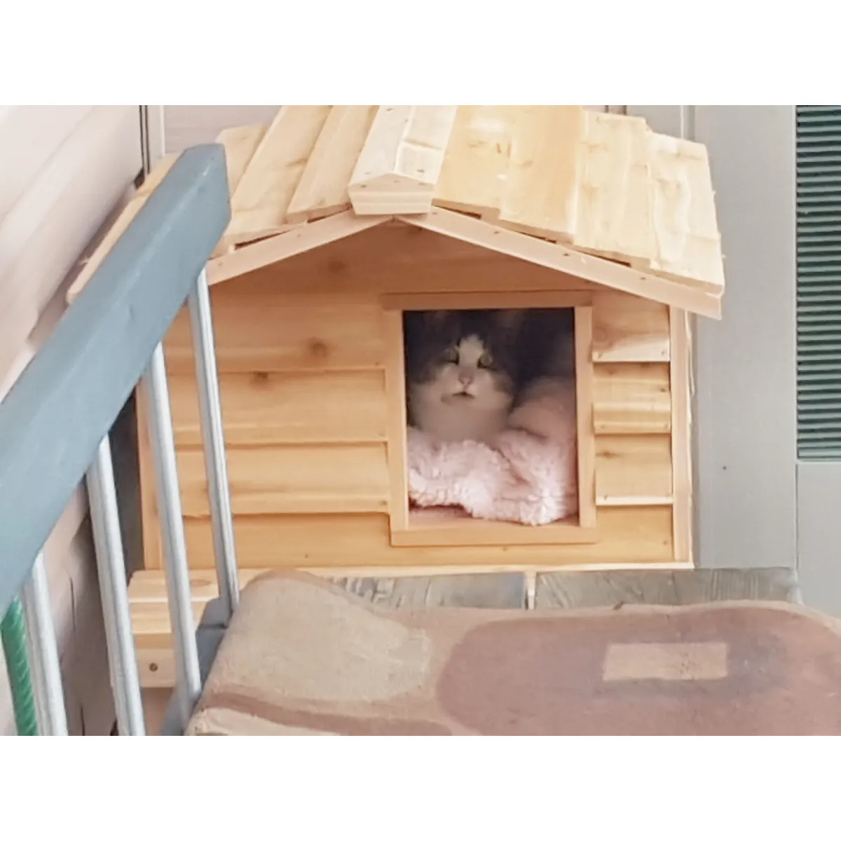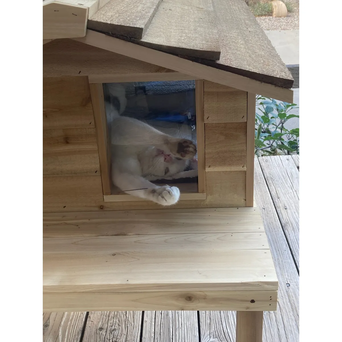 Raised on a 14" high platform with a comfortable lounging deck to catch a cat nap in the morning sun, the cat house also features an extended roof to add more shelter from precipitation. Designed to accommodate one large or two medium-sized cats at once, it's also an ideal outside hangout for your beloved indoor kitty, who has to be around you as you work in the garden or on the lawn. No matter which feline friends you add to this cat shelter, both of you will be meowing in delight all day long!