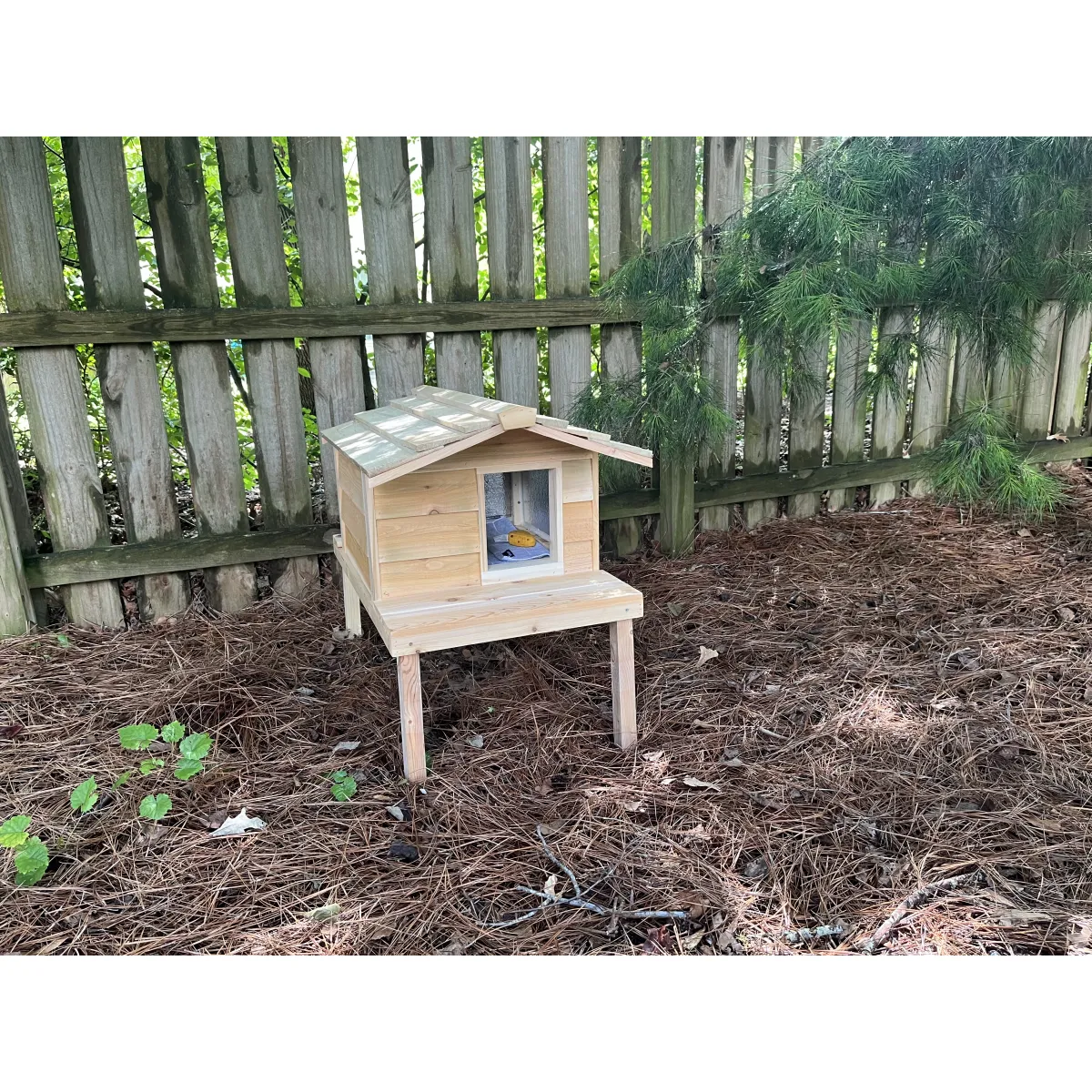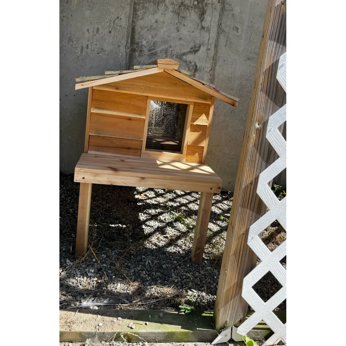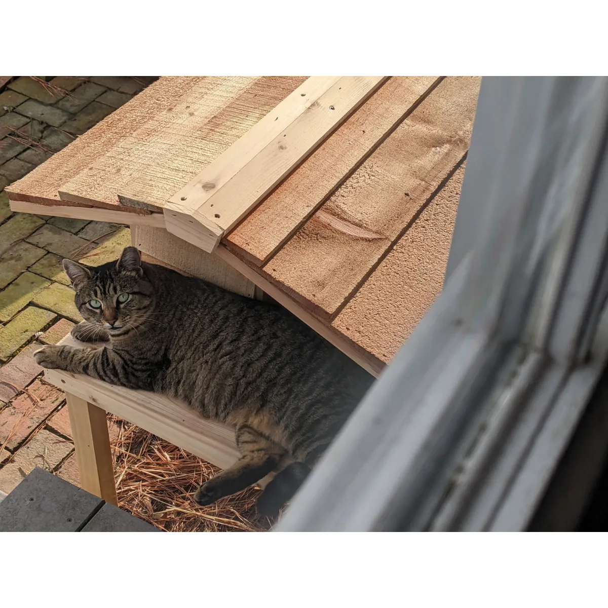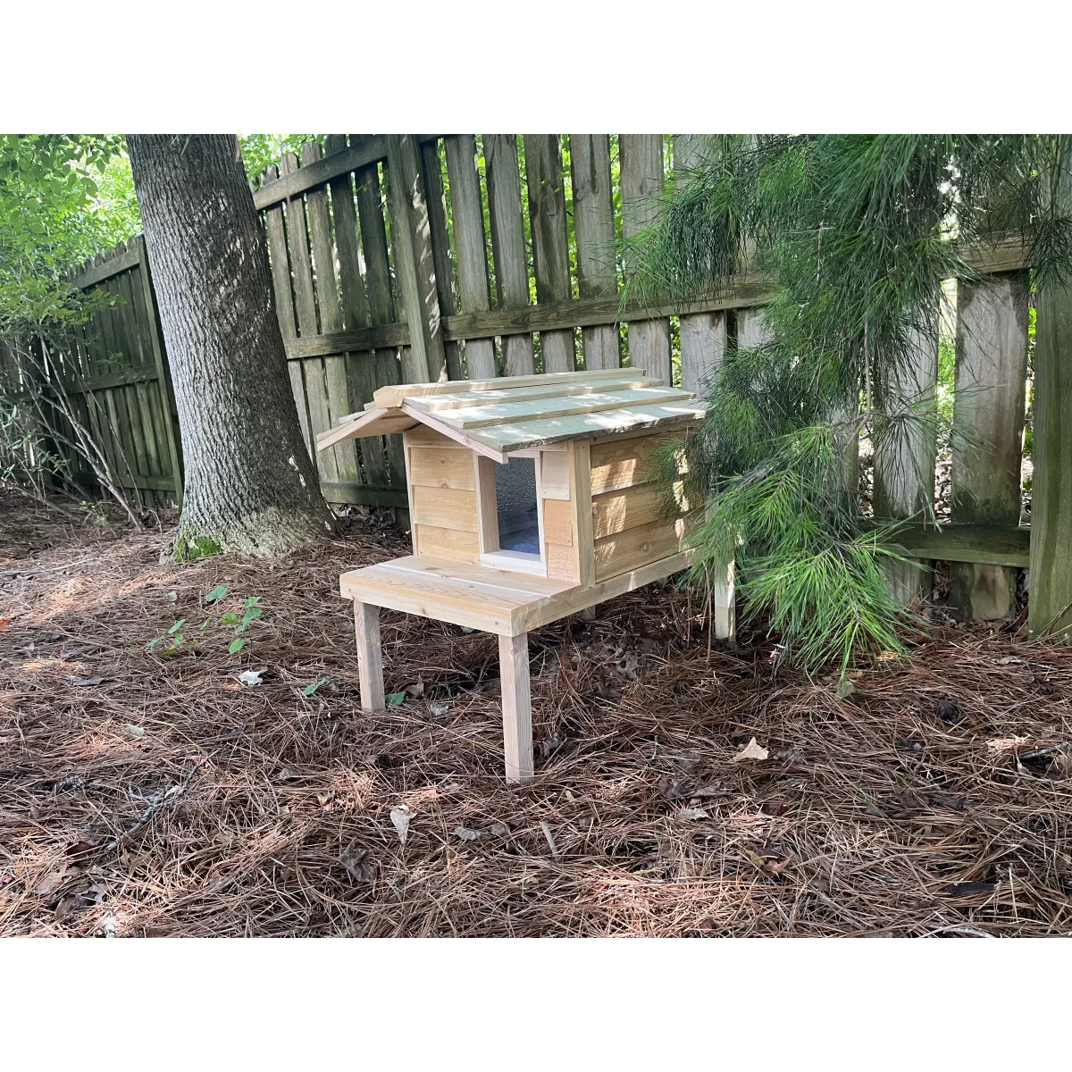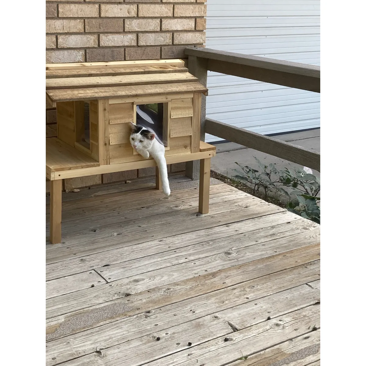 This wooden cat house with an extended roof provides feral cats with the shelter they need from the sun, cold, and moisture. Statistics show that there are an estimated 480 million homeless cats worldwide. Of this number, many are ferals, born in the wild, and continue to populate the feline world. But even though they don't have a home, these beautiful cats deserve somewhere to call their own! This lovely, elevated cat house is a great solution for housing one or two feral cats and is one of our best sellers. It is handcrafted from long-lasting cedar and insulated with Thermal-Ply to keep the kitties warm in winter and cool in summer.