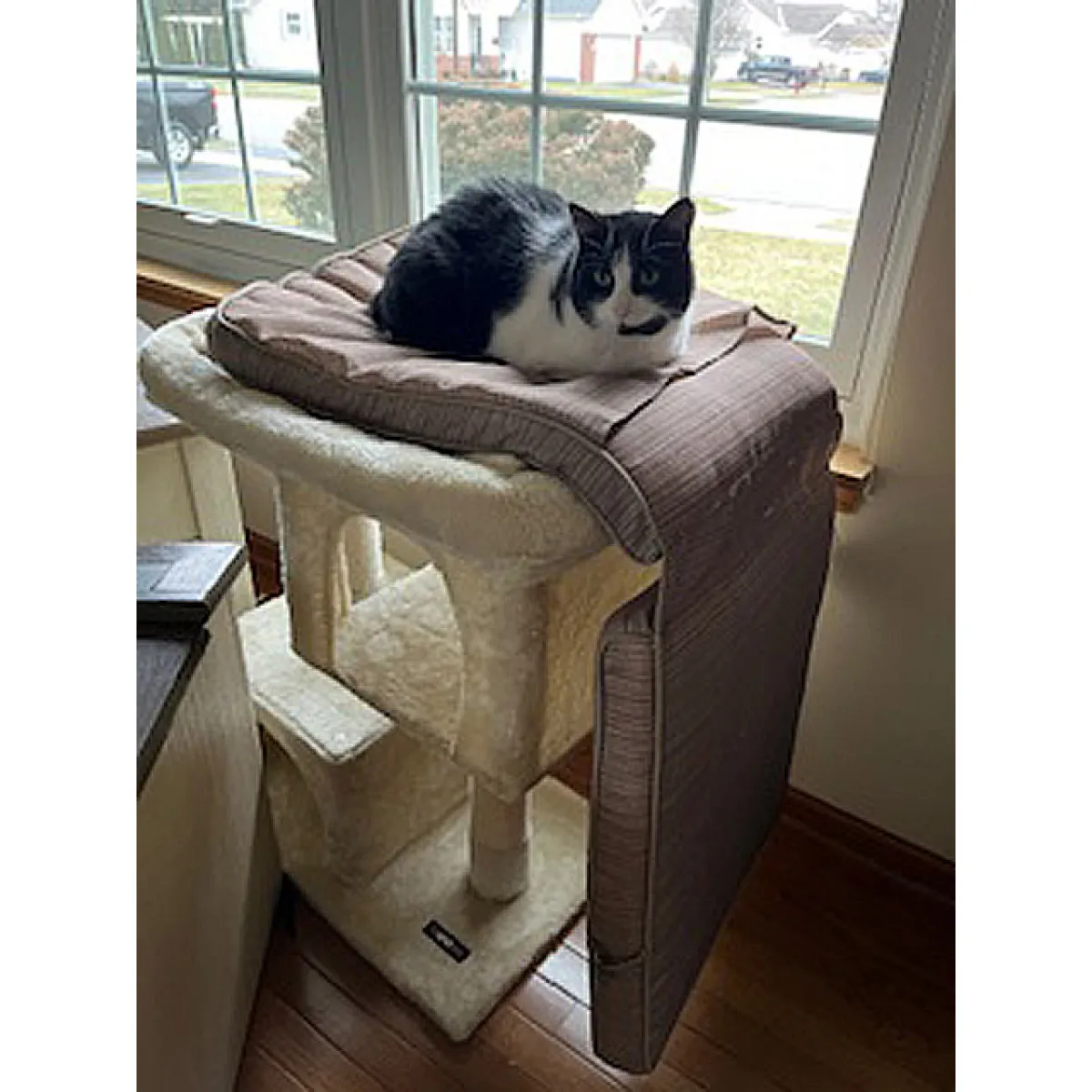 Cat parents with large or senior cats in their homes will find this cat condo most suitable for their interior living space, particularly those with limited space. Both of the posts holding the cat furniture together are covered in plush and sisal rope that cats love to use for stretching and sharpening their claws. The double base adds stability while kitties jump, scratch, or rest on the stand, and the included anti-toppling fittings can help you secure it to a wall if desired.