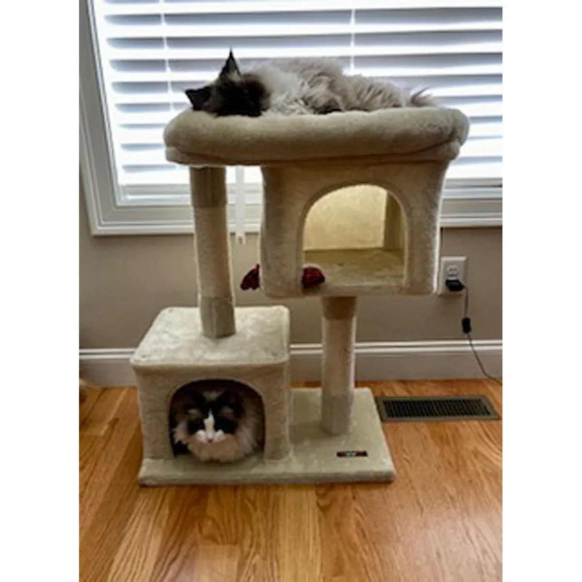 Senior and skittish cats can snuggle up inside one of the two condos with their soft, plush surfaces and privacy, and the very top of this small cat tree offers a large cushioned bed with raised edges that will give the large cats the comfort they deserve. Cats that love resting together or enjoying each other's company will find the dual cat condo design of this practical cat playground most convenient.