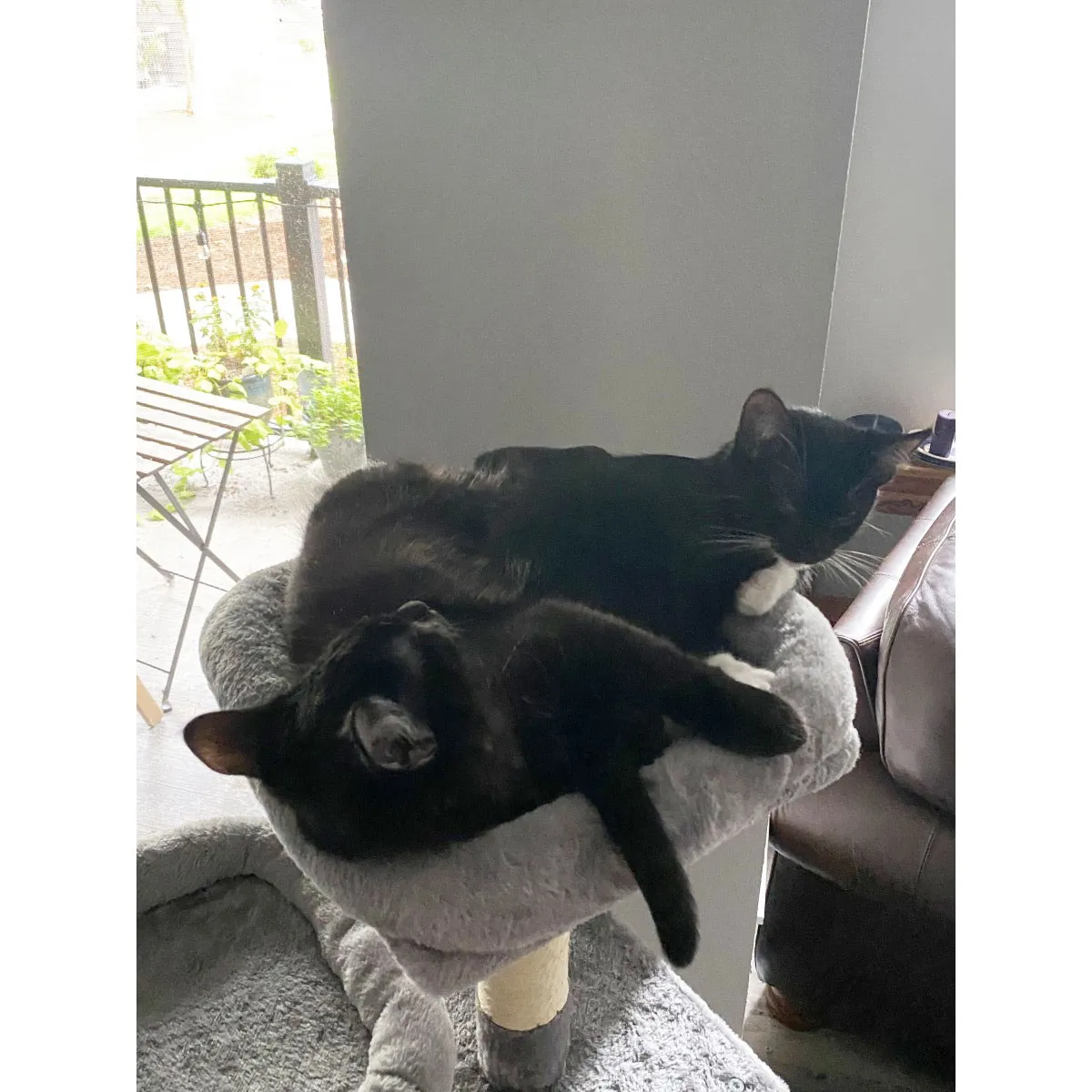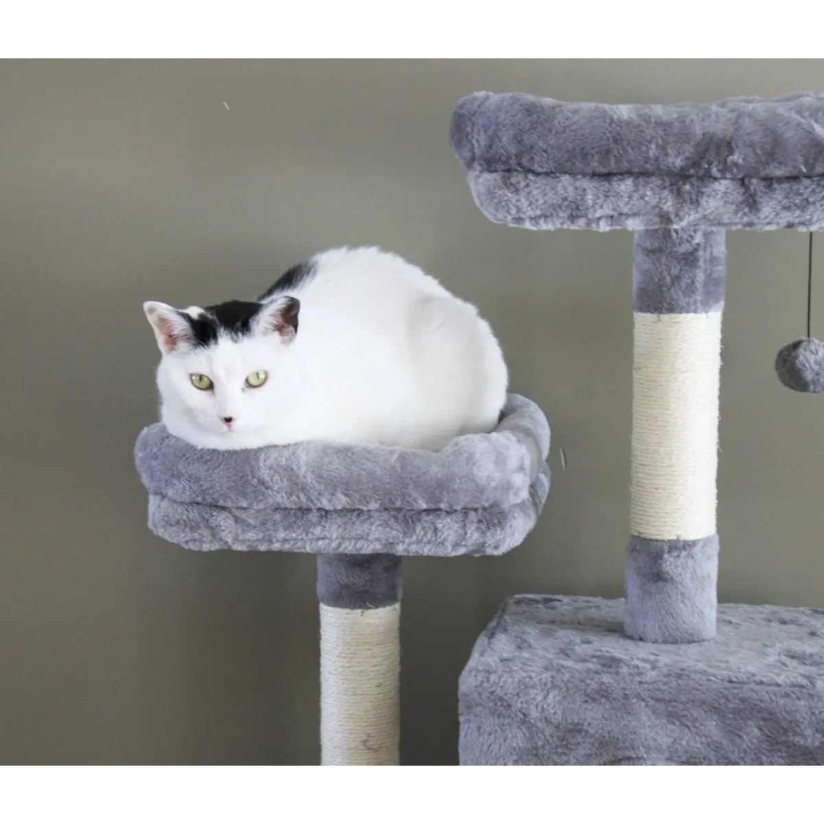 There are also plenty of places for your cats to rest in this multi-level tall but narrow cat tree. The large cat hammock at the bottom is a great starting point for sleeping, and the platform above provides a sturdy resting spot and climbing aid. One level up is the cozy cat condo with extra entrances for stretching out comfortably. The pair of top perches with plush-lined raised edges provide the best views plus a chance to play thanks to the pom-pom toys attached. This nice cat tree is especially suitable for households with two or three cats.