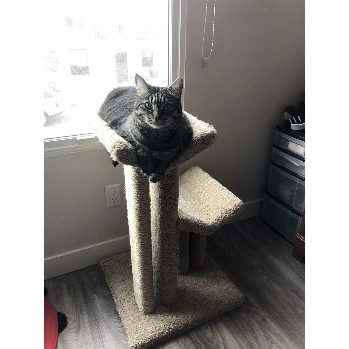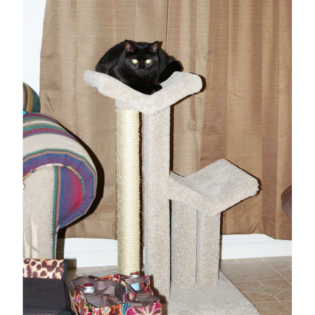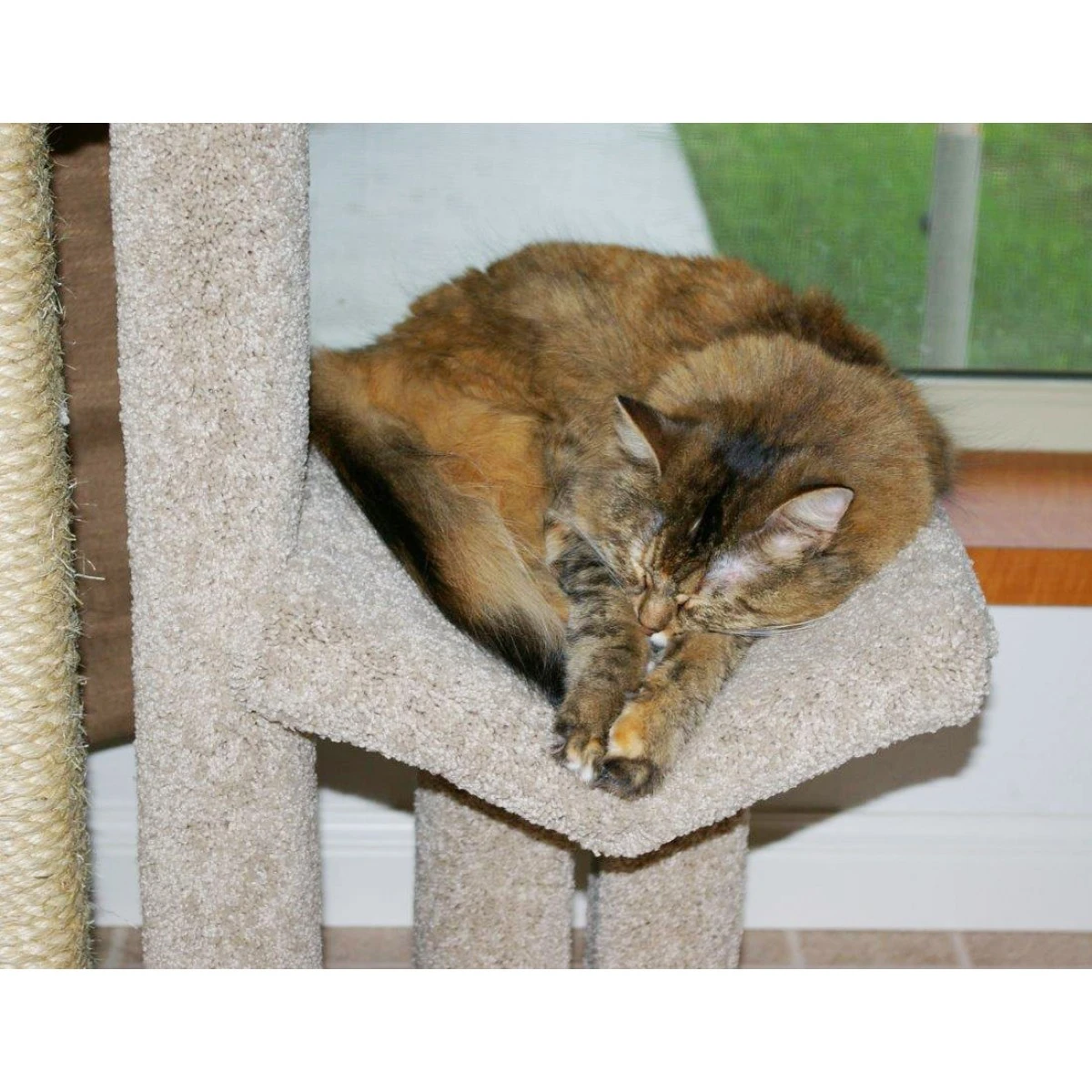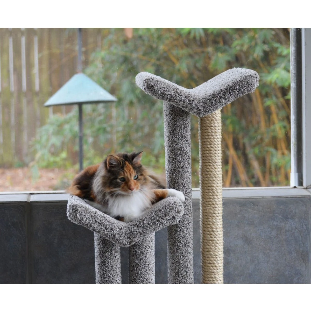 One tall post is fully wrapped with sisal rope to give your cats a place to scratch, sharpen their claws, and exercise