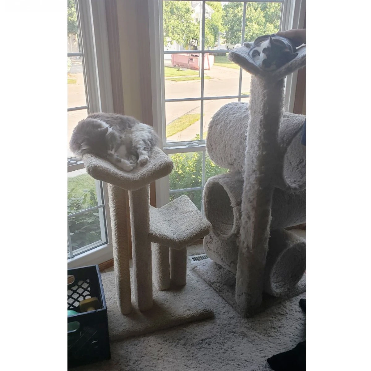 Any chance all the poles could be sisal? Also, I have very large Siberian cats. Do you have round or square baskets that are 18-29 inches in beige that could replace these? (So hoping you do!) Also, is the carpet treated with any chemicals, i.e., flame regardants, stain resistant chemicals, and/or other toxic chemicals? Is this made in the USA?